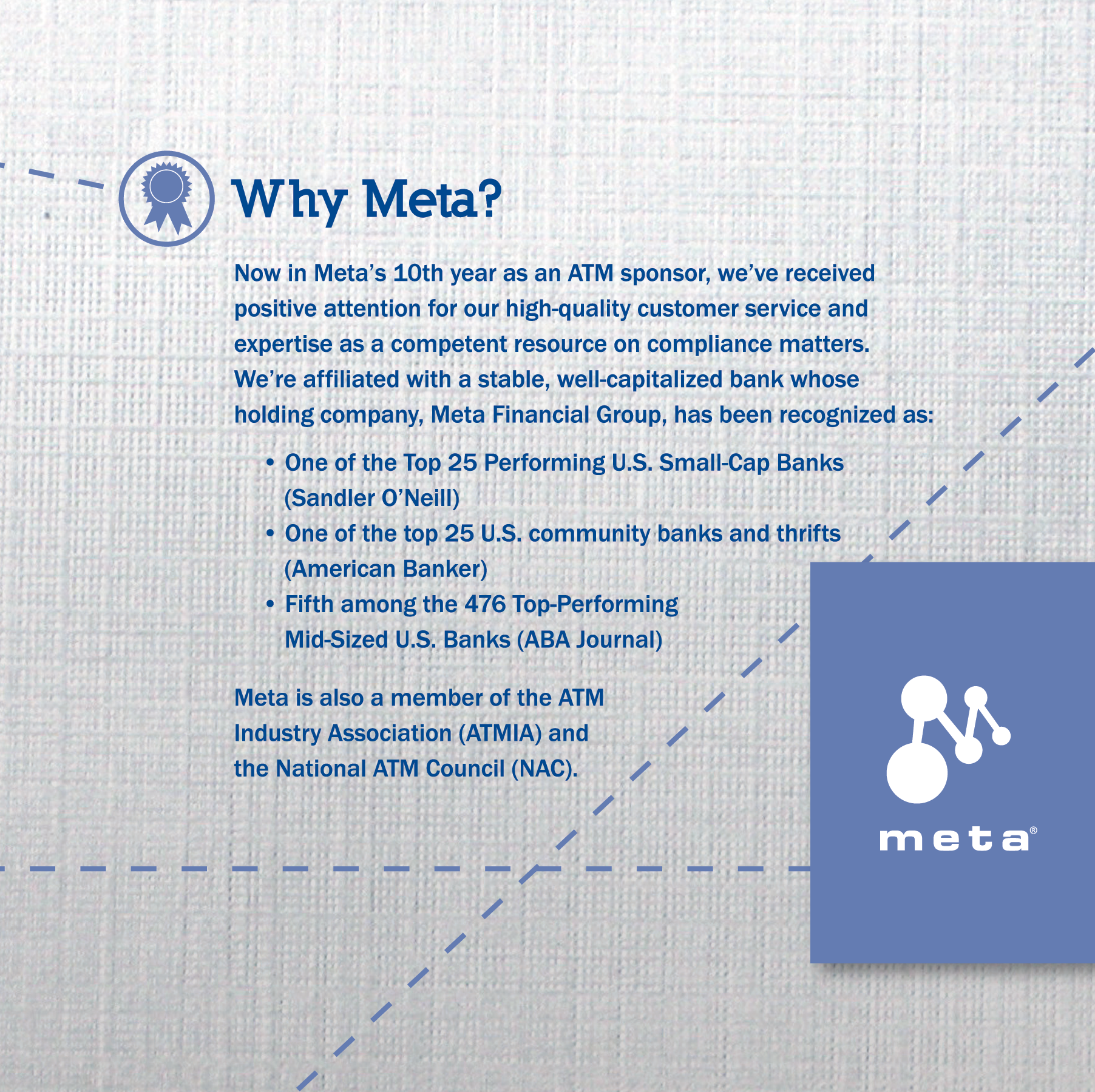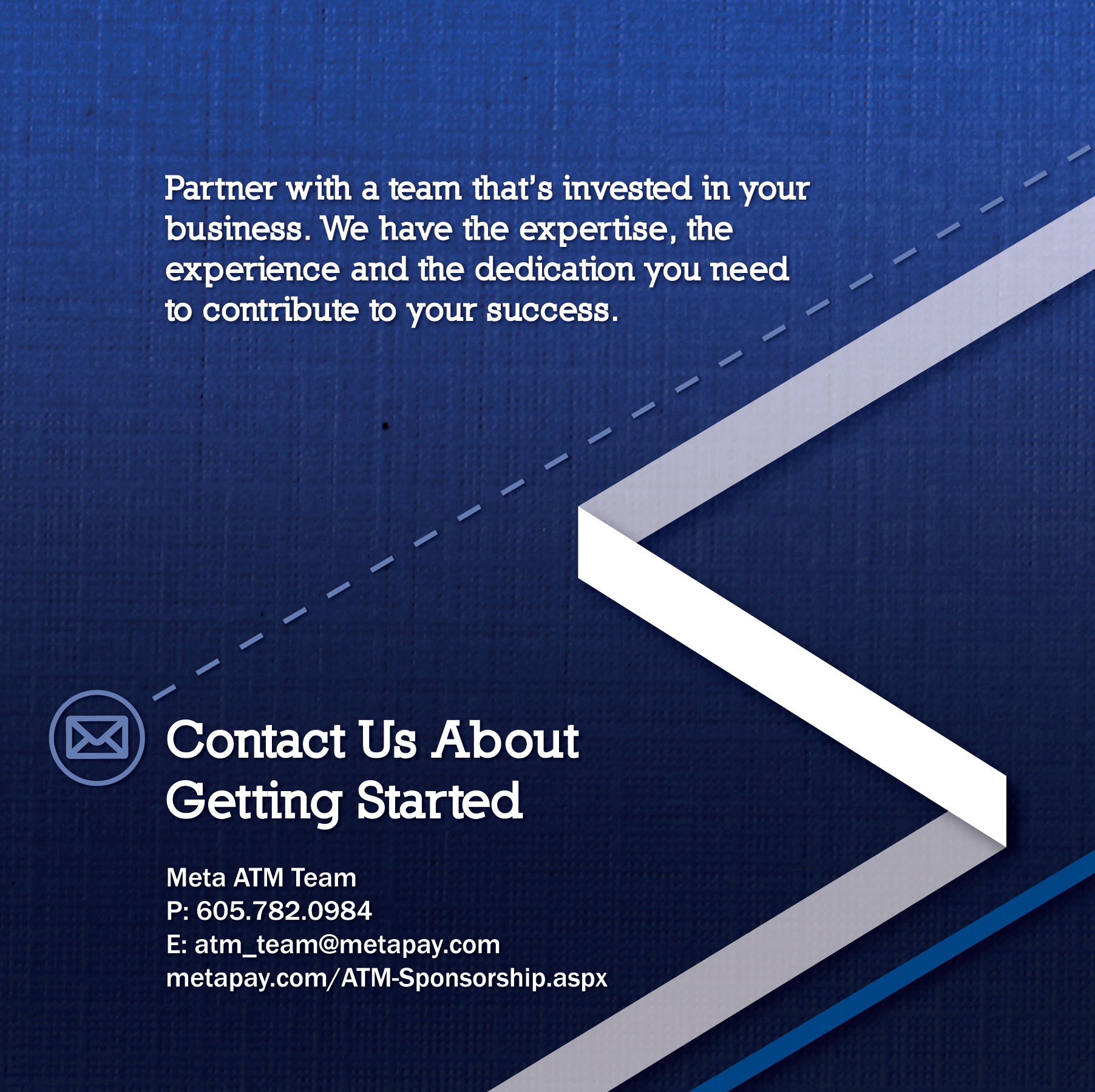 This brochure was done for the ATM Sponsorship team at Meta Payment Systems. They don't typically use much collateral, so they wanted this to be small and simple. It folds to a 6-inch square.